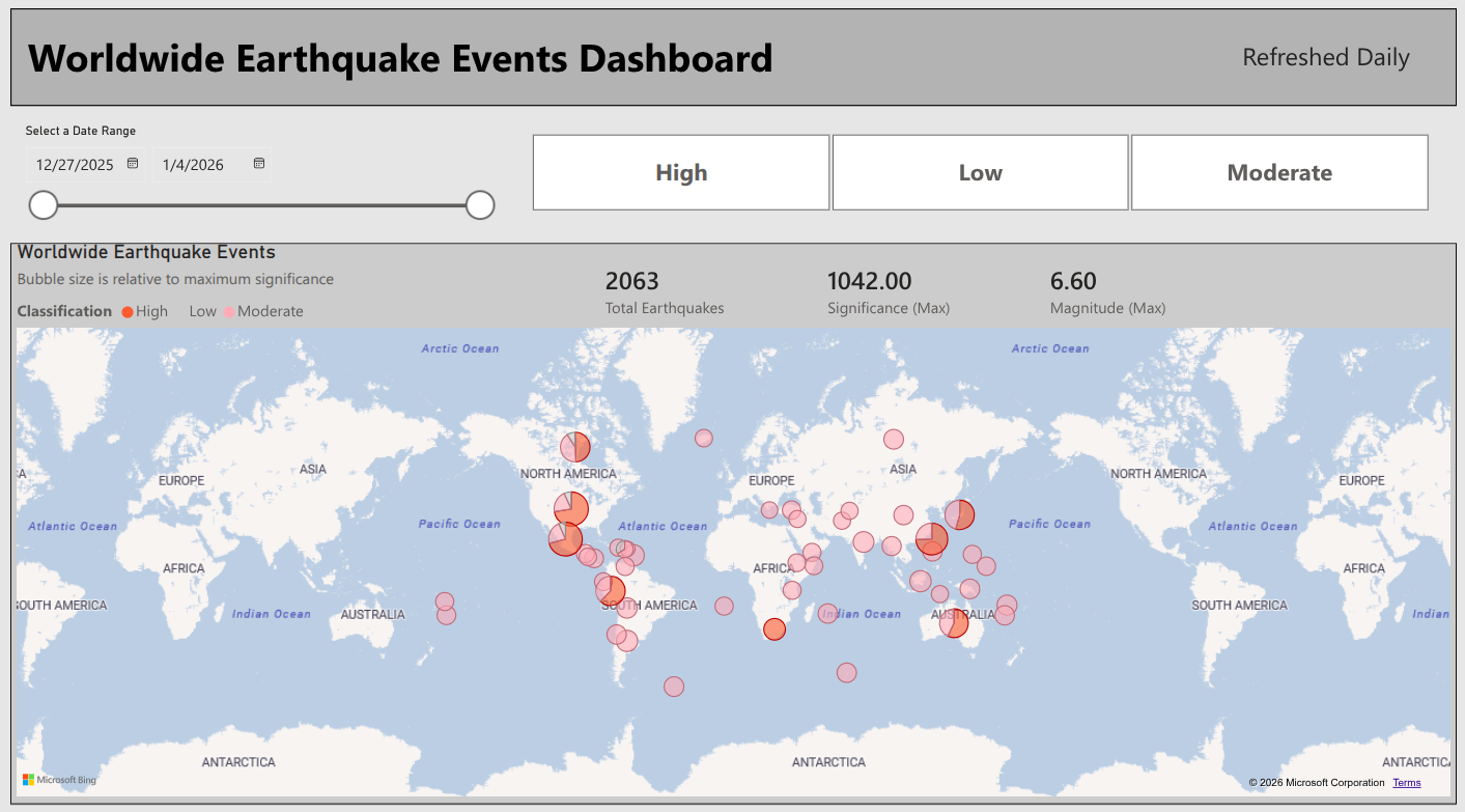 earthquake_events_goldtable was added to the model for reporting access. - Report Visual Design: