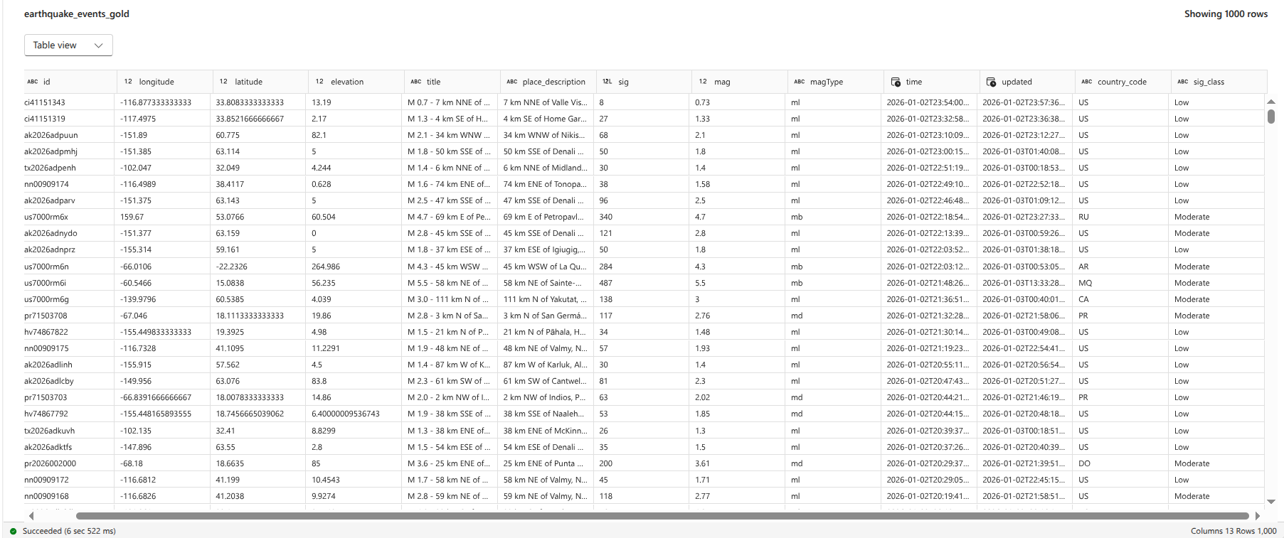 earthquake_events_gold, making it the definitive source for BI reporting. In the final implementation, the notebook included logic to filter the Silver table for records occurring after the receivedstart_dateparameter to prevent reprocessing duplicate data during subsequent runs.