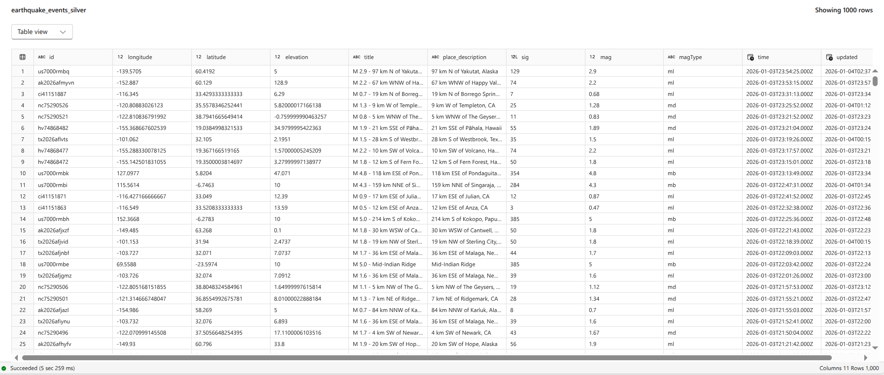 earthquake events silverin the Lakehouse. This Delta table format provides transactional capabilities, facilitating efficient data appending for subsequent daily processes.
