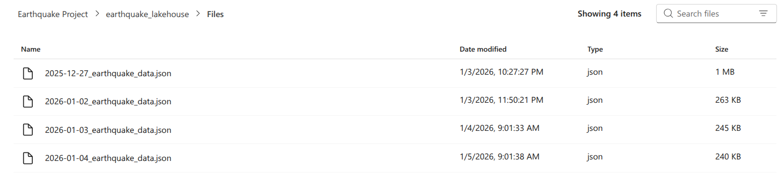 filessection. The file path was constructed using the patternLakehouse default.files/[start_date]_earthquake_data.json. Using thestart_dateas a prefix ensured that when running the ingestion process daily, new data would be written to a unique file, preventing overwriting and aiding data retention. I used thejson.dumpmethod with the mode set to write (w) to handle the file writing.