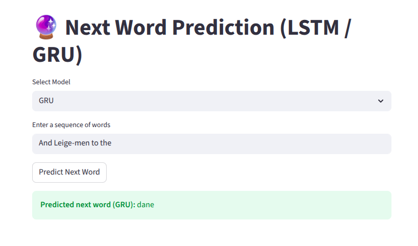 The app allows users to enter a short sequence of words and predicts the most likely next word based on a trained neural network model. It supports both LSTM and GRU architectures, enabling easy comparison between the two.