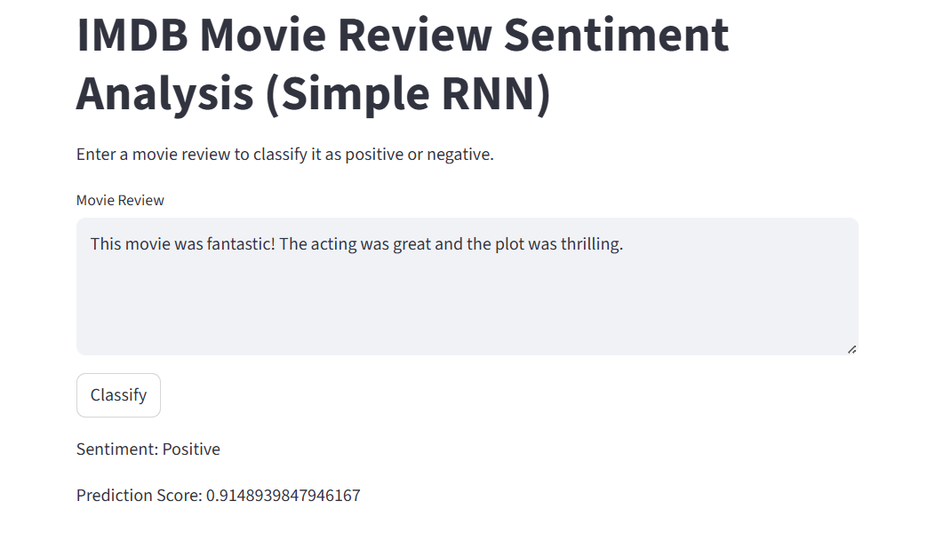 A text area is created for the user to input a movie review. When the classify button is clicked, the input is preprocessed and passed to the model for prediction. The result is displayed in the app as shown below.