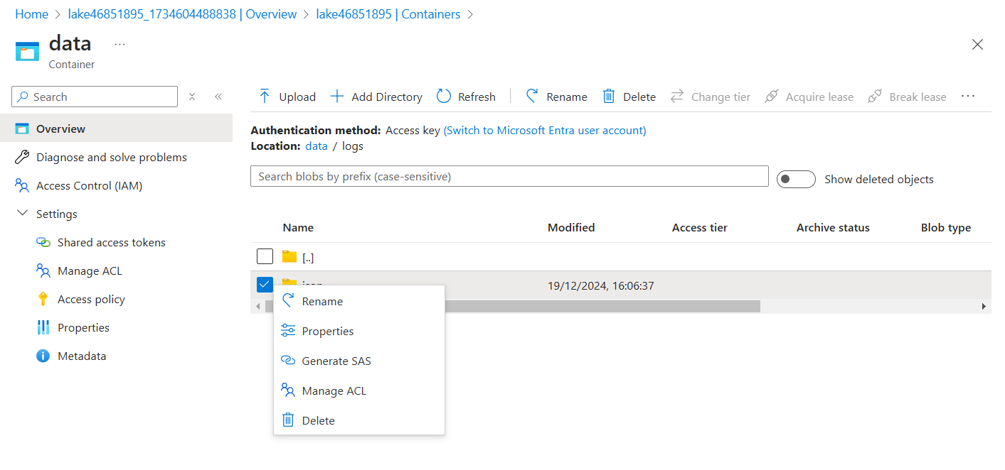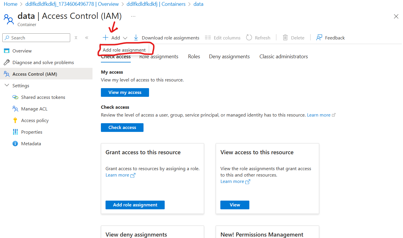Now, assign the ACL permissions to the container “data” by clicking on manage ACL on the left settings