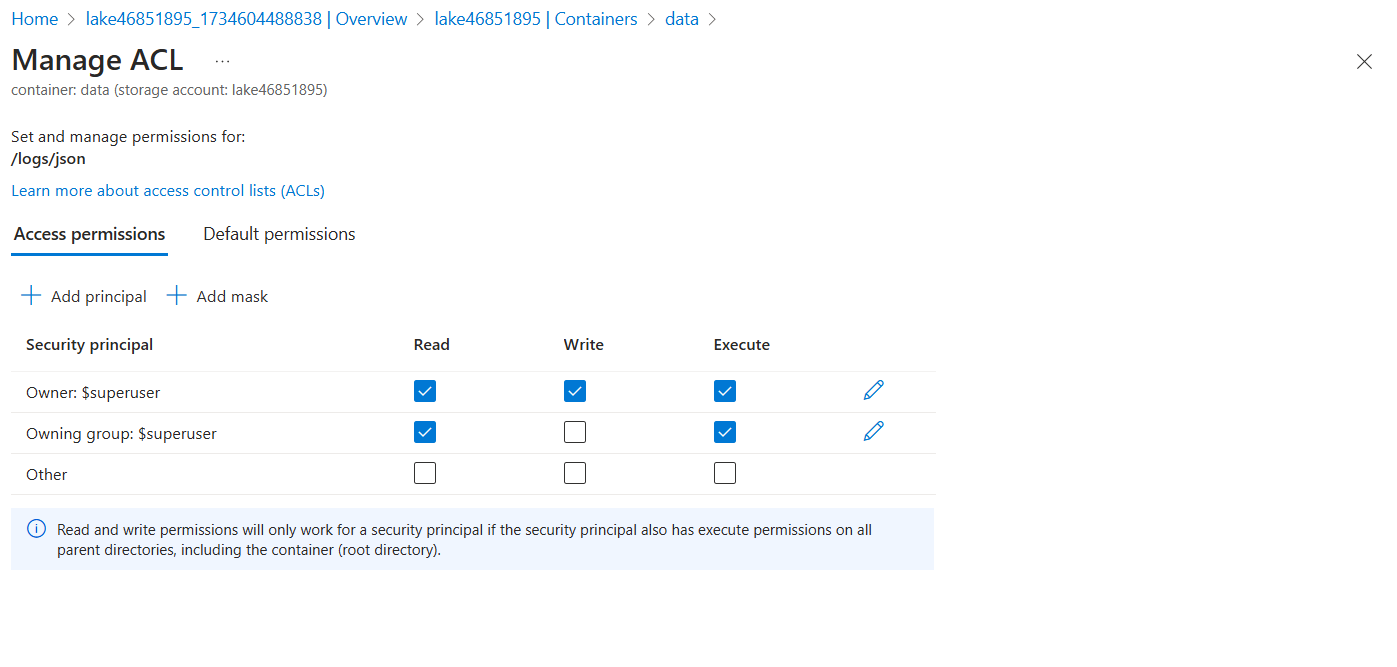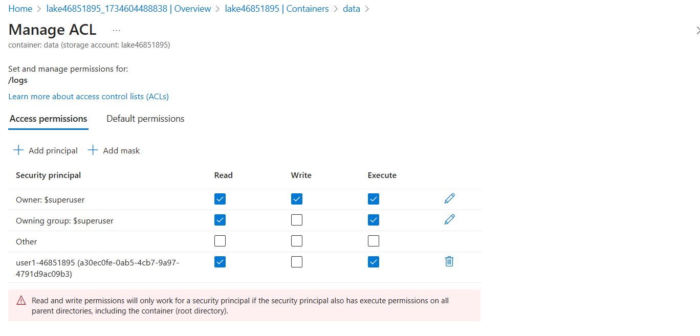 ACL permissions do not support inheritance, so you will have to set execute permissions on all parent directories, including the container—the root directory. You will also need to set read permissions so that the user can display the directory structure of the container in the Azure portal for testing.