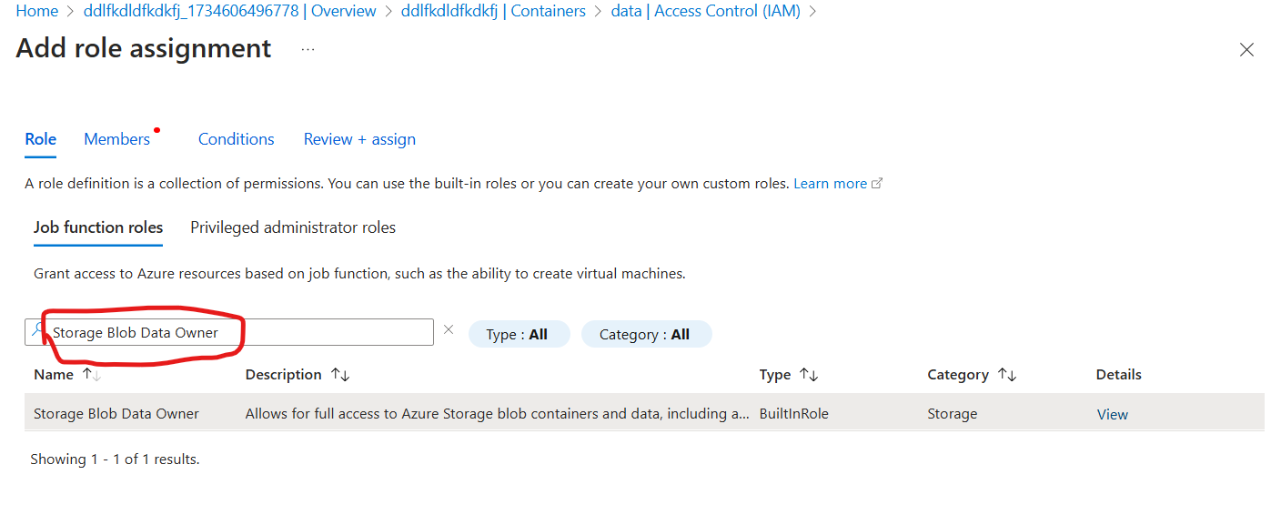 for this, click on Access control (IAM) on the left of container overview page and choose “Storage Blob Data Owner” in add role option and add member “user”