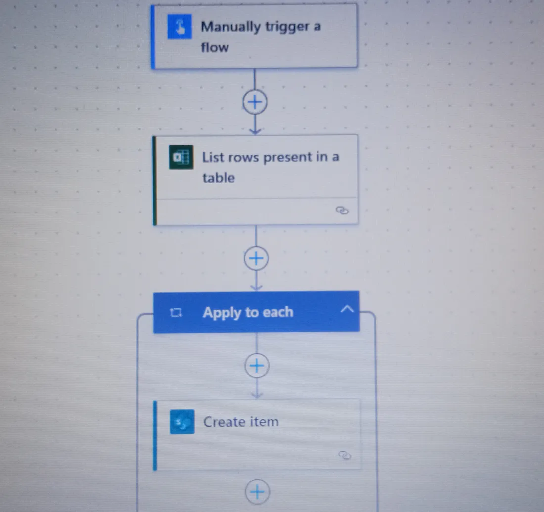 - Action Inside Loop: “Create item” (creates a new item in SharePoint for each row in the Excel table).