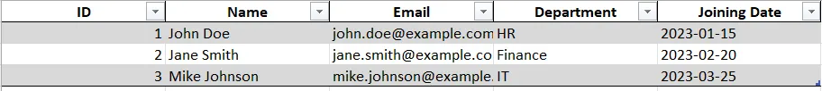 - Select the Table within the Excel file. Ensure your Excel table has column names like ID, Name, Email, Department, and Joining Date