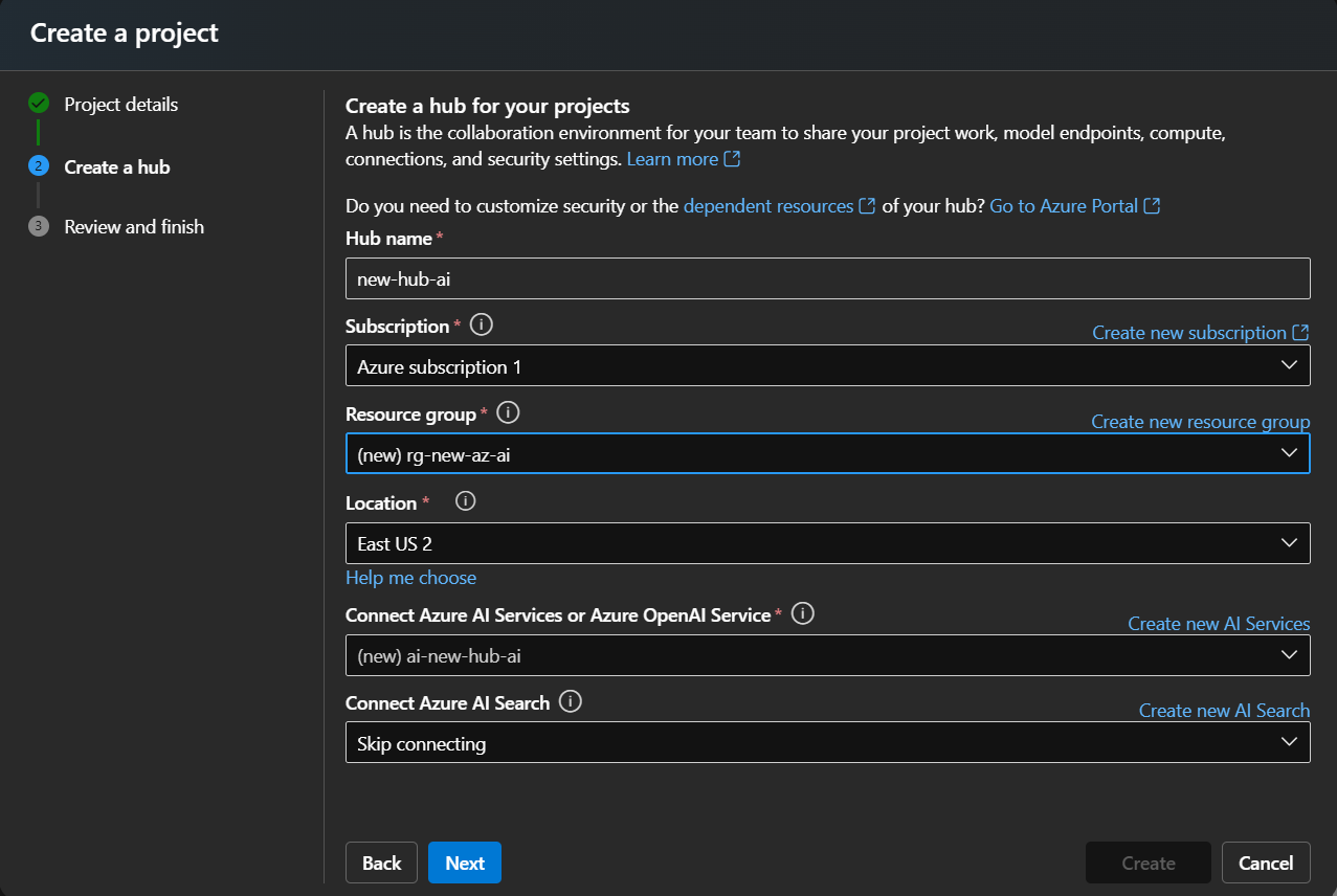 Use Azure AI Foundry portal to create a hub and project to build an AI solution.