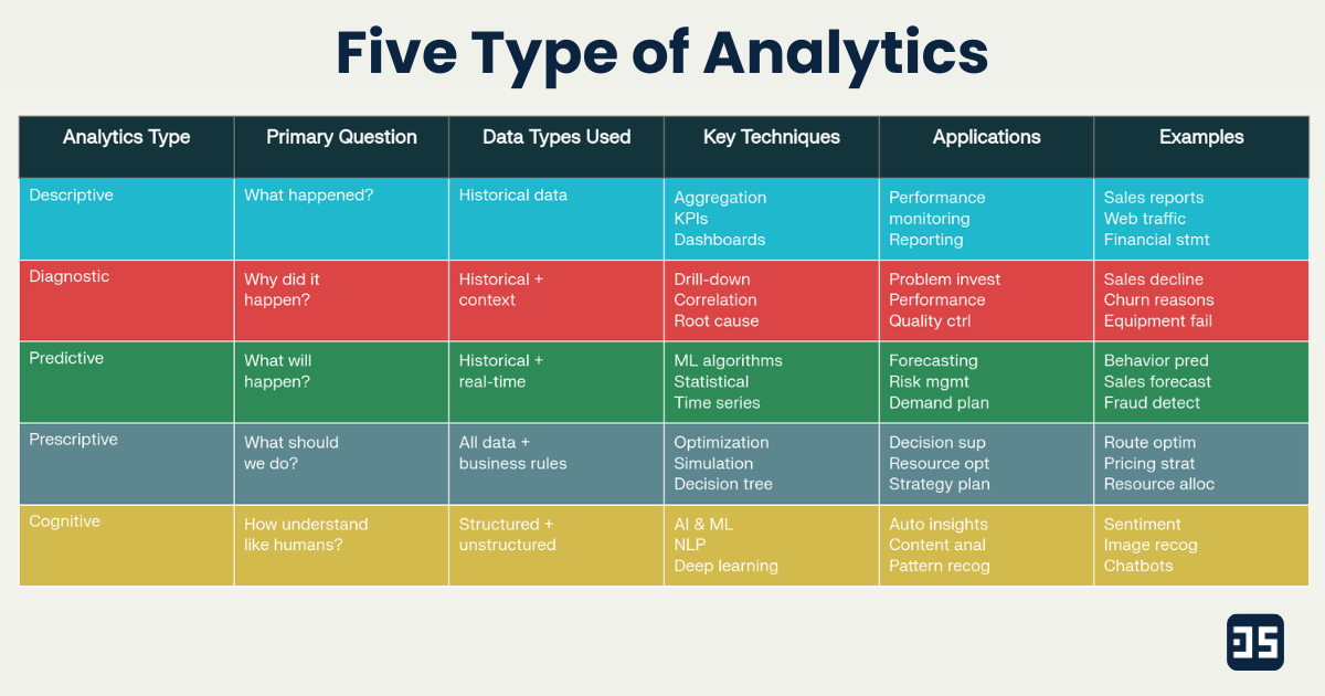 From basic historical reporting to AI-powered cognitive insights, these analytics types form a comprehensive framework that enables businesses to maximize the value of their data investments.